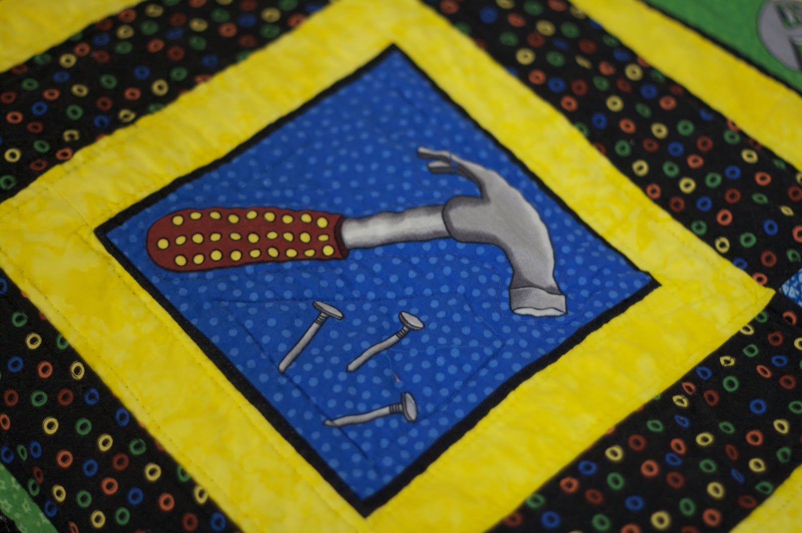 I realized I never showed off my mom's handiwork! She made this fun quilt for Conner using a kit she bought while on vacation. Each square is a different tool. She even embroidered his name on the toolbox square.